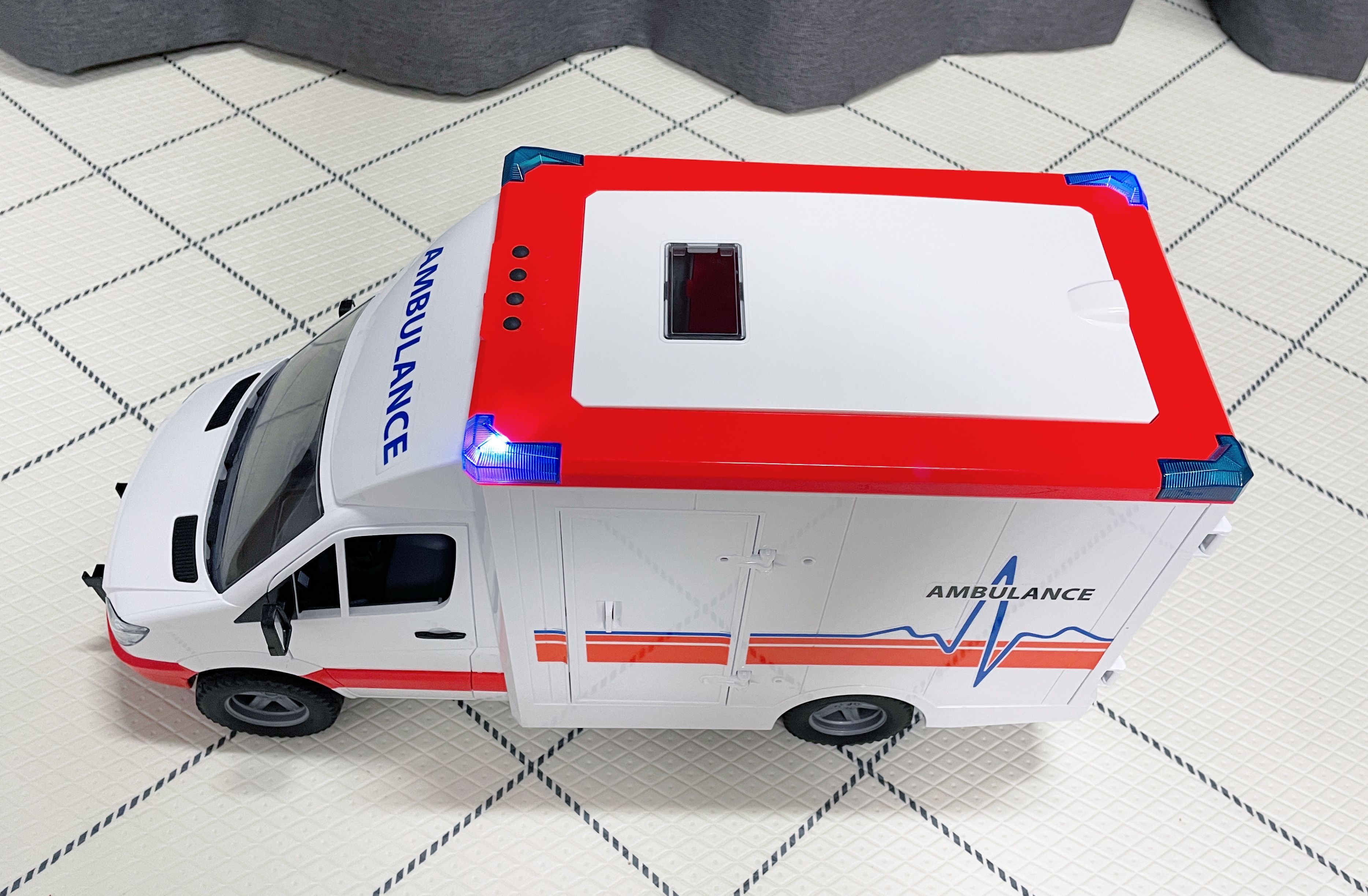 환자 이송 베드는 실제와 똑같이 위아래 높이 조절이 가능하게 되어있습니다. 자동차 안에는 베드를 고정할 수 있는 레일도 깔려 있습니다. 내부 인테리어가 실제 구급차의 내부와 유사하여 해당 제품을 통해 구급차 내부가 어떻게 생겼는지 알 수 있습니다.