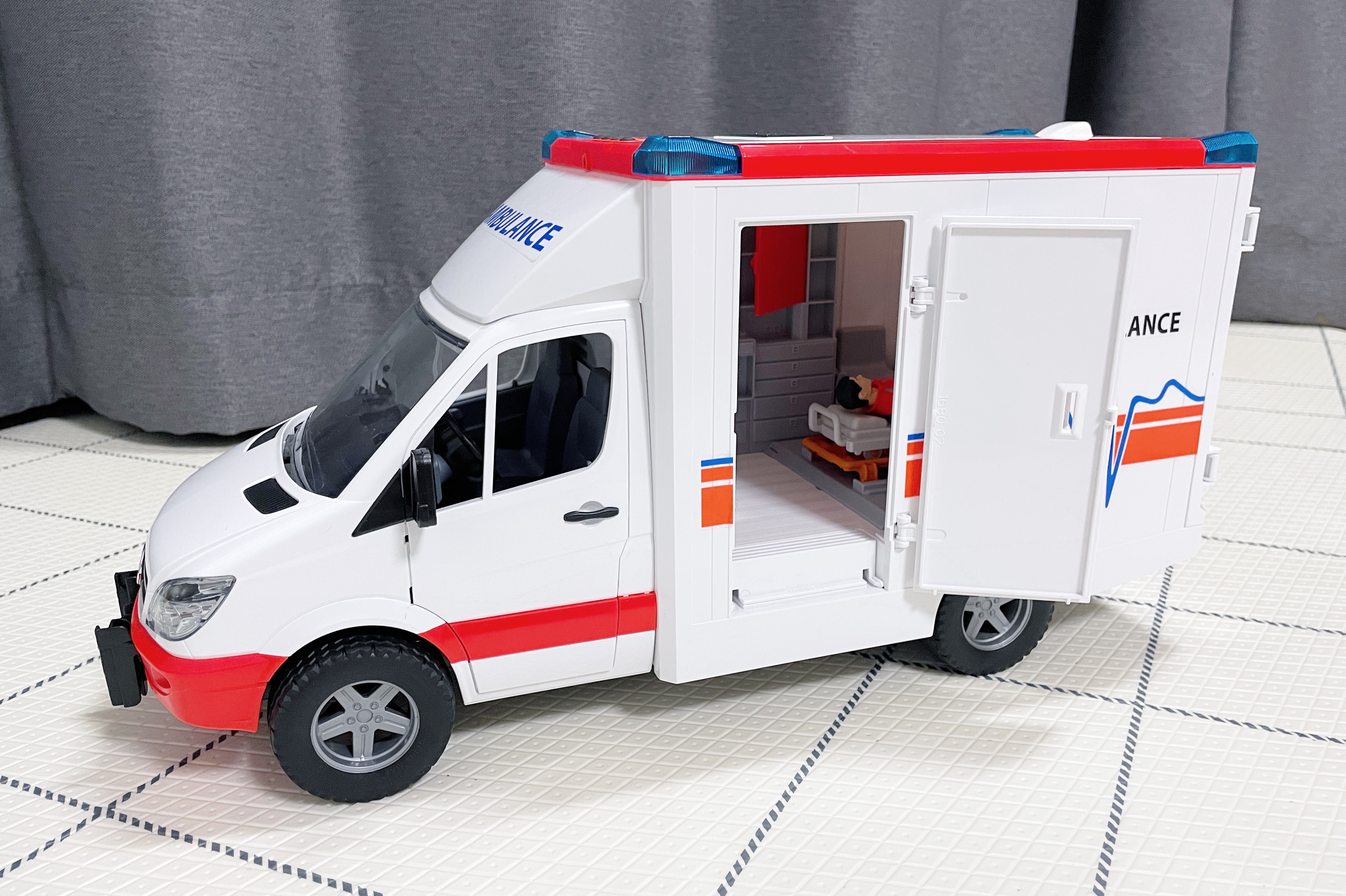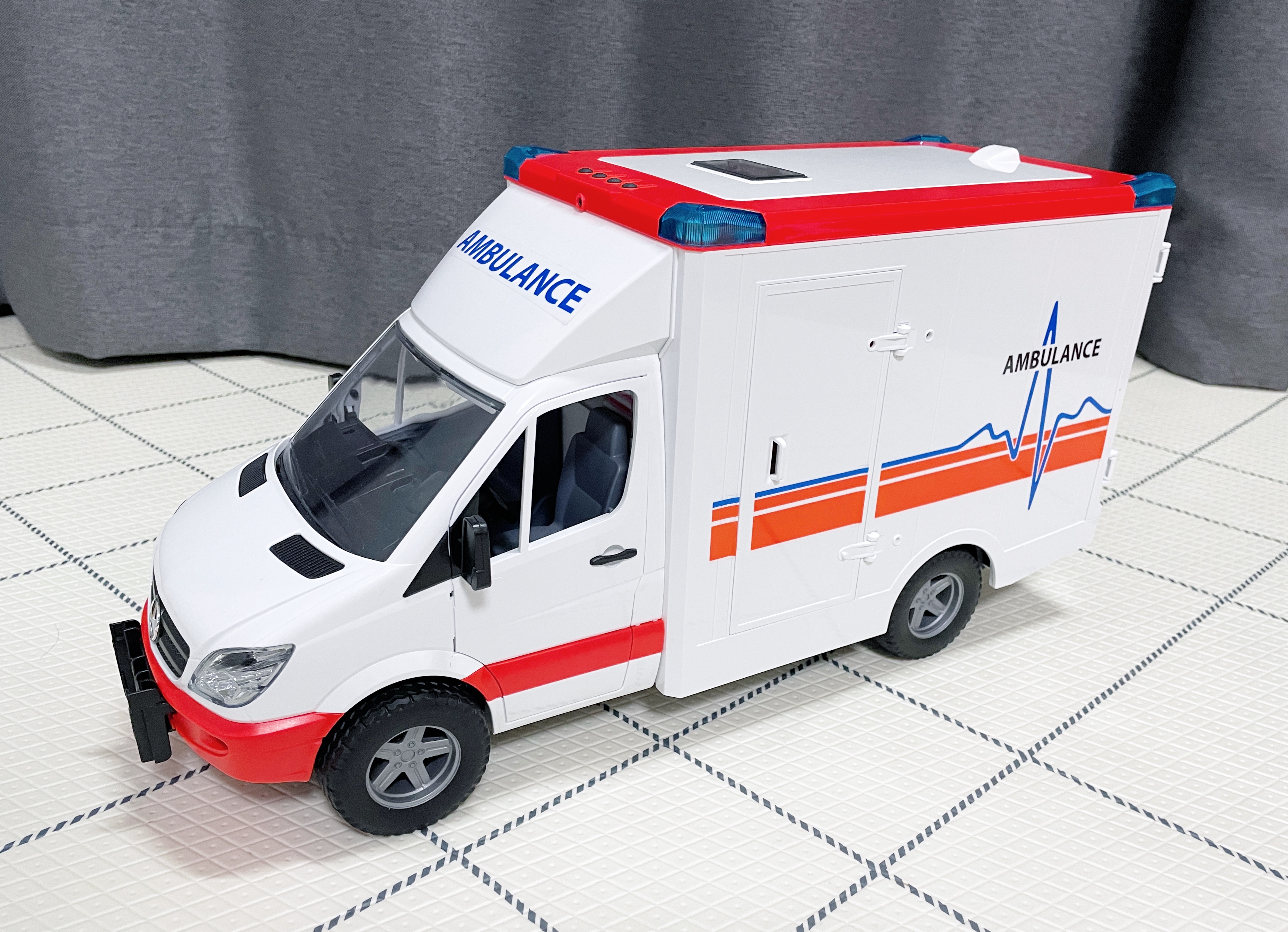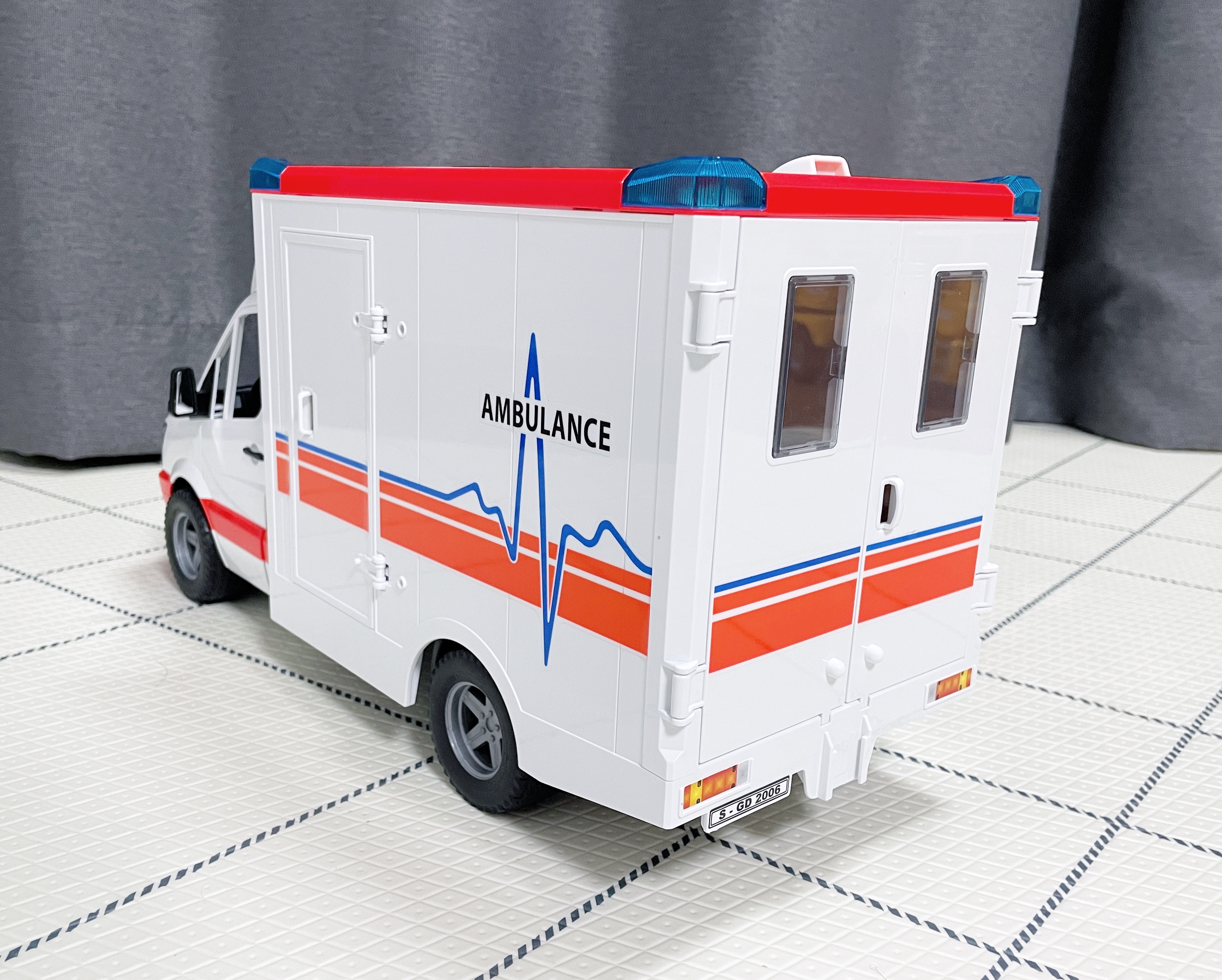 bruder 사의 대형 구급차입니다. 소방차와 구급차에 열광하는 어린아이들에게 완소 장난감이 될 수 있습니다. bruder사의 완구답게 모든 면에서 다른 조악한 구급차들과 차원을 달리하는 디테일과 만듬새를 보여줍니다.