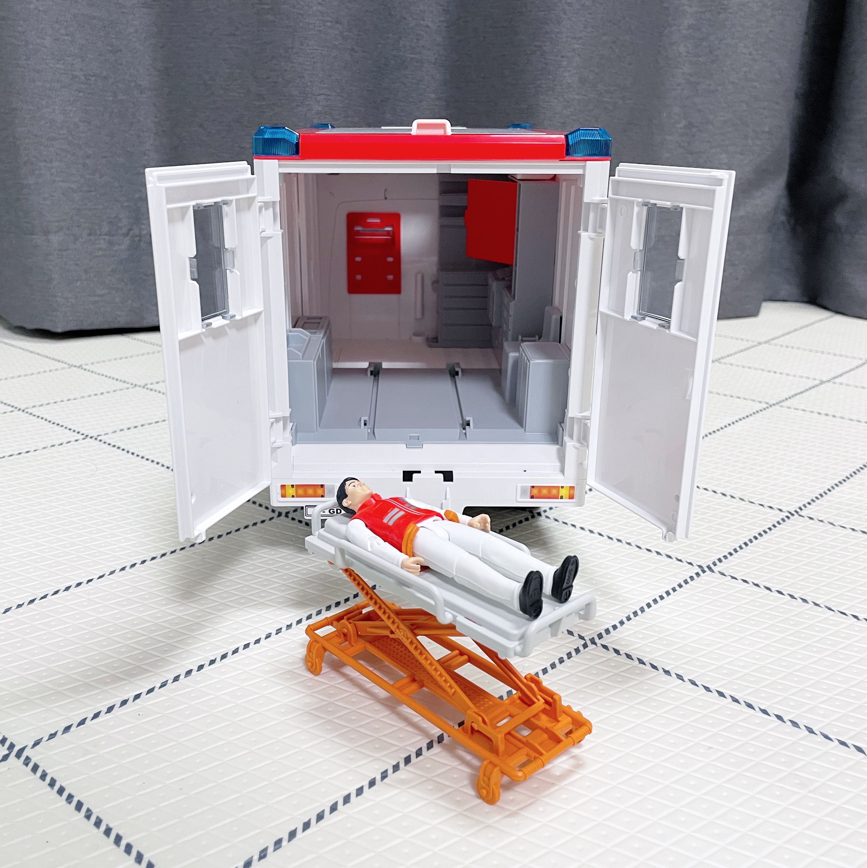 구급차의 내부를 들어다 볼 수 있어 아이들이 흥미롭게 가지고 놀 수 있습니다. 기본으로 제공되는 구급대원 피규어를 운전석에 앉히거나 환자 운반 베드에 눕혀서 환자 이송하는 모습을 구현할 수도 있습니다. 자동차 상단, 뒷문 모두 완전히 개방이 가능하여 내부 모습을 자세히 볼 수 있고 가지고 놀기도 쉽습니다.