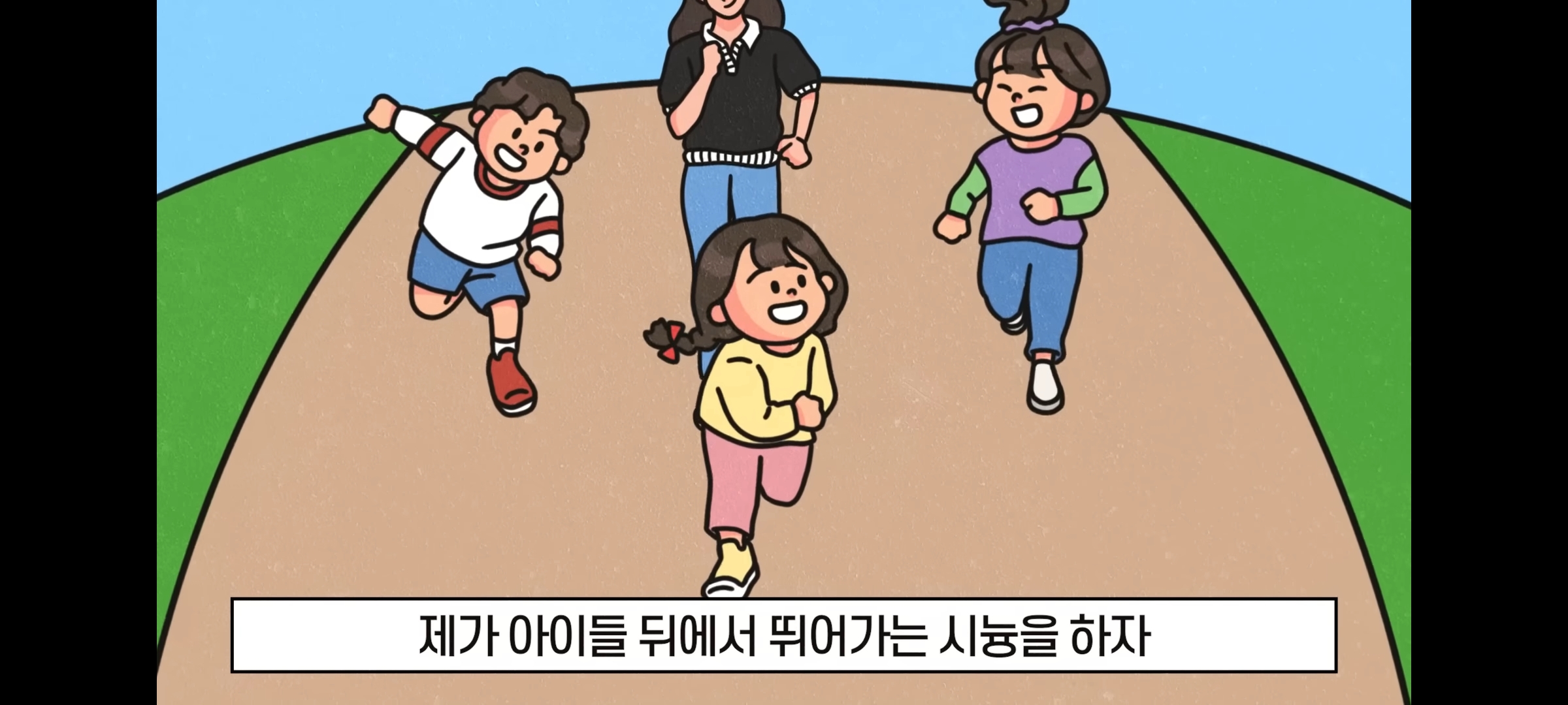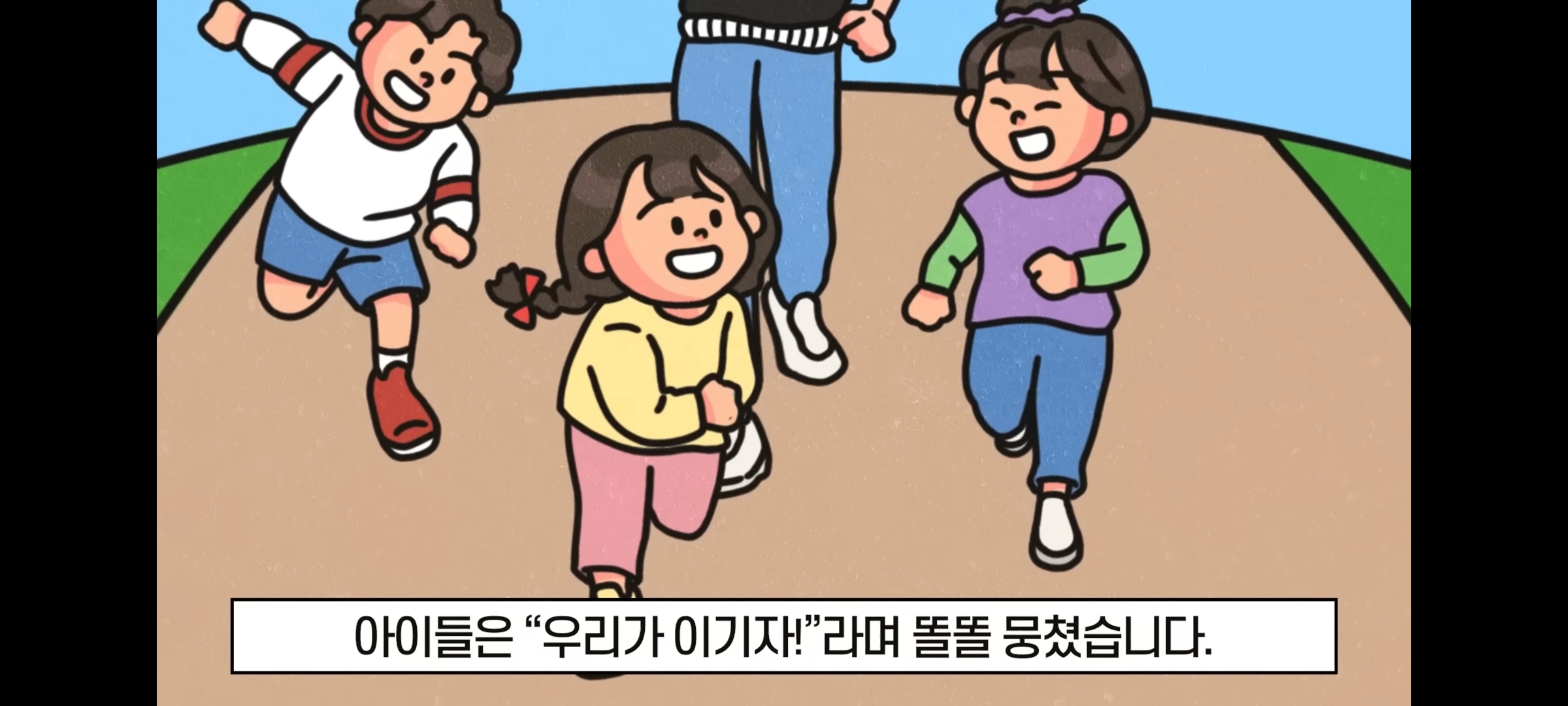 제가 아이들 뒤에서 뛰어가는 시늉을 하자 아이들은 "우리가 이기자!"라며 똘똘 뭉쳤습니다.