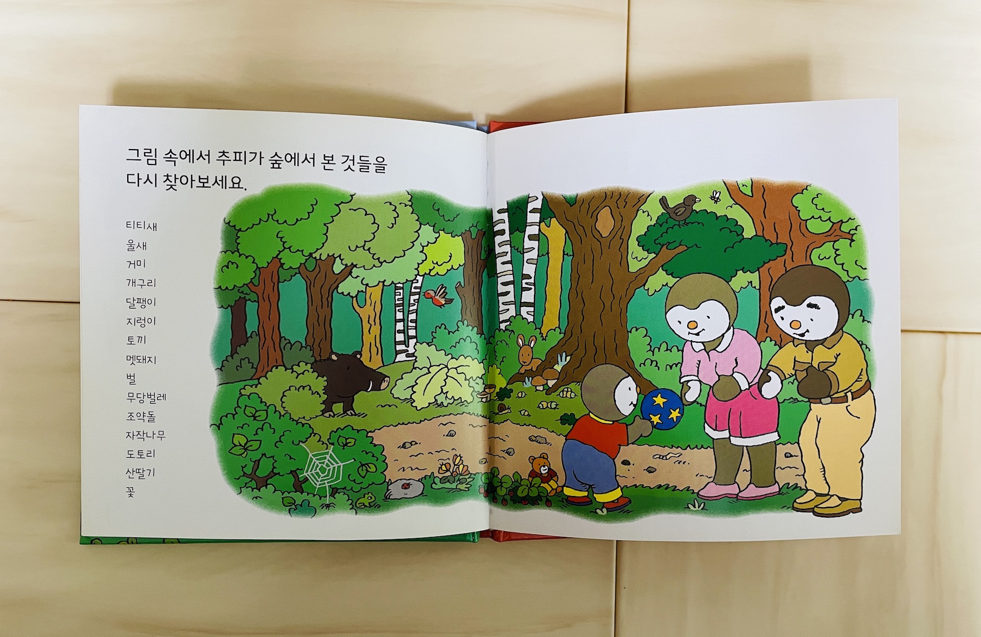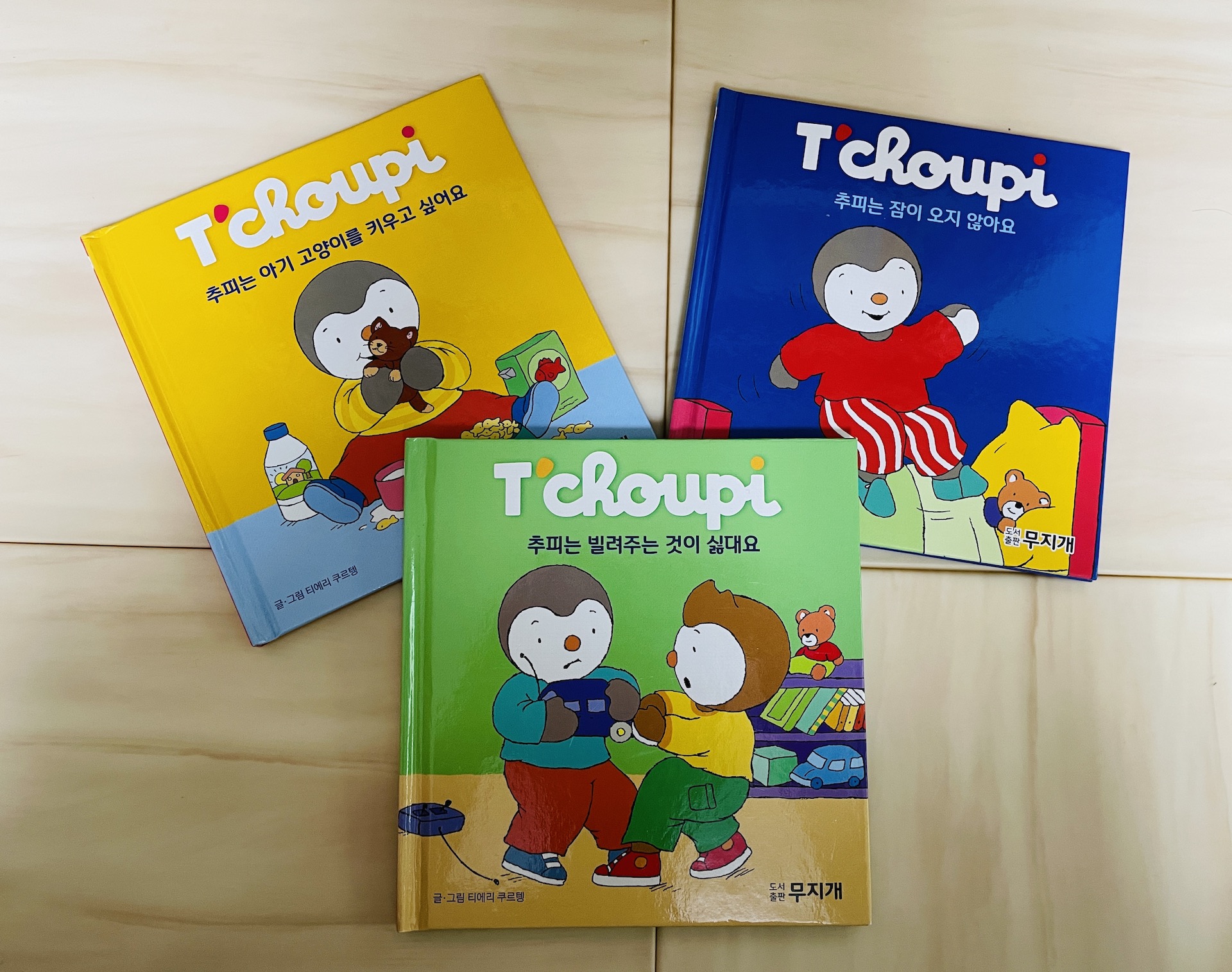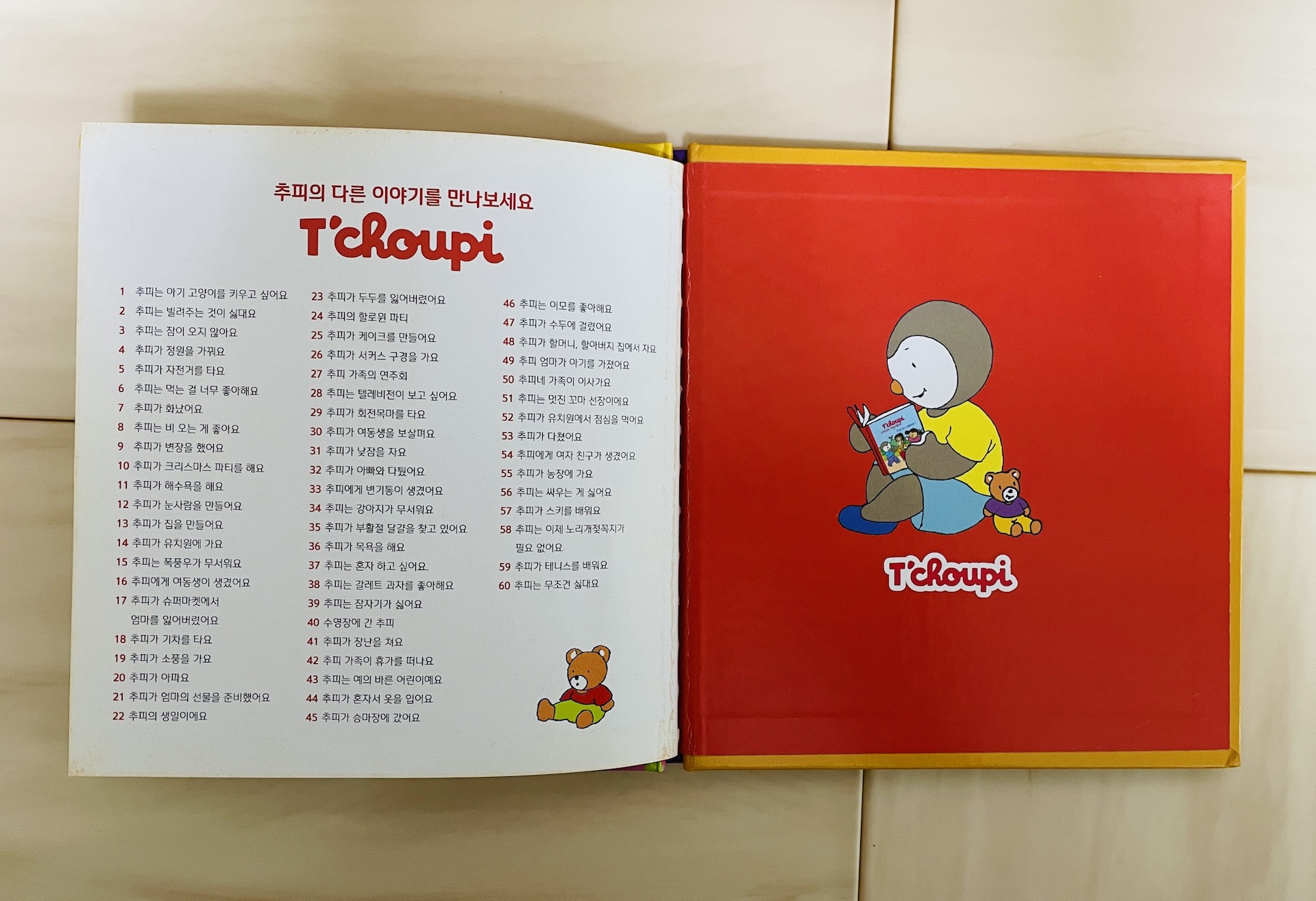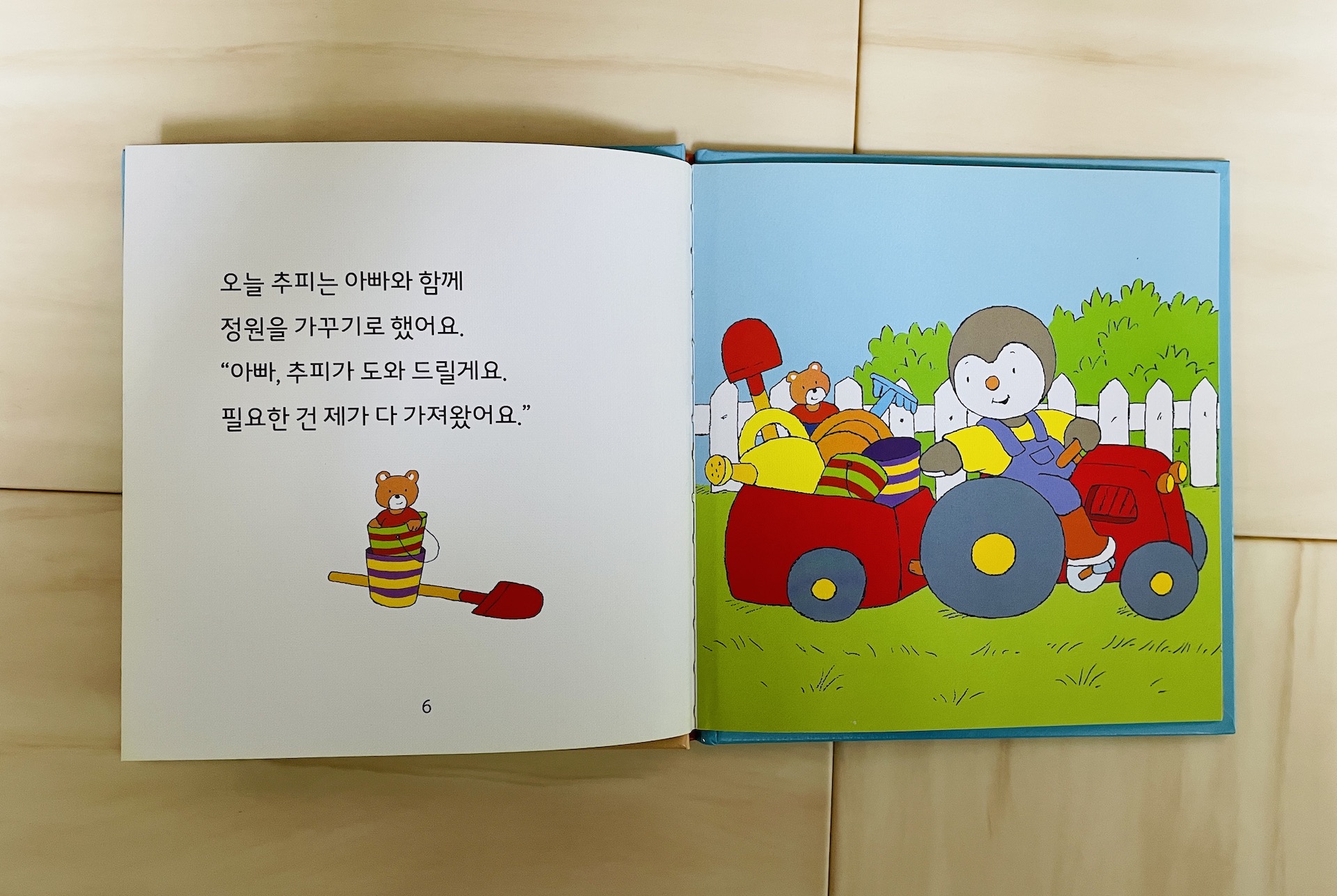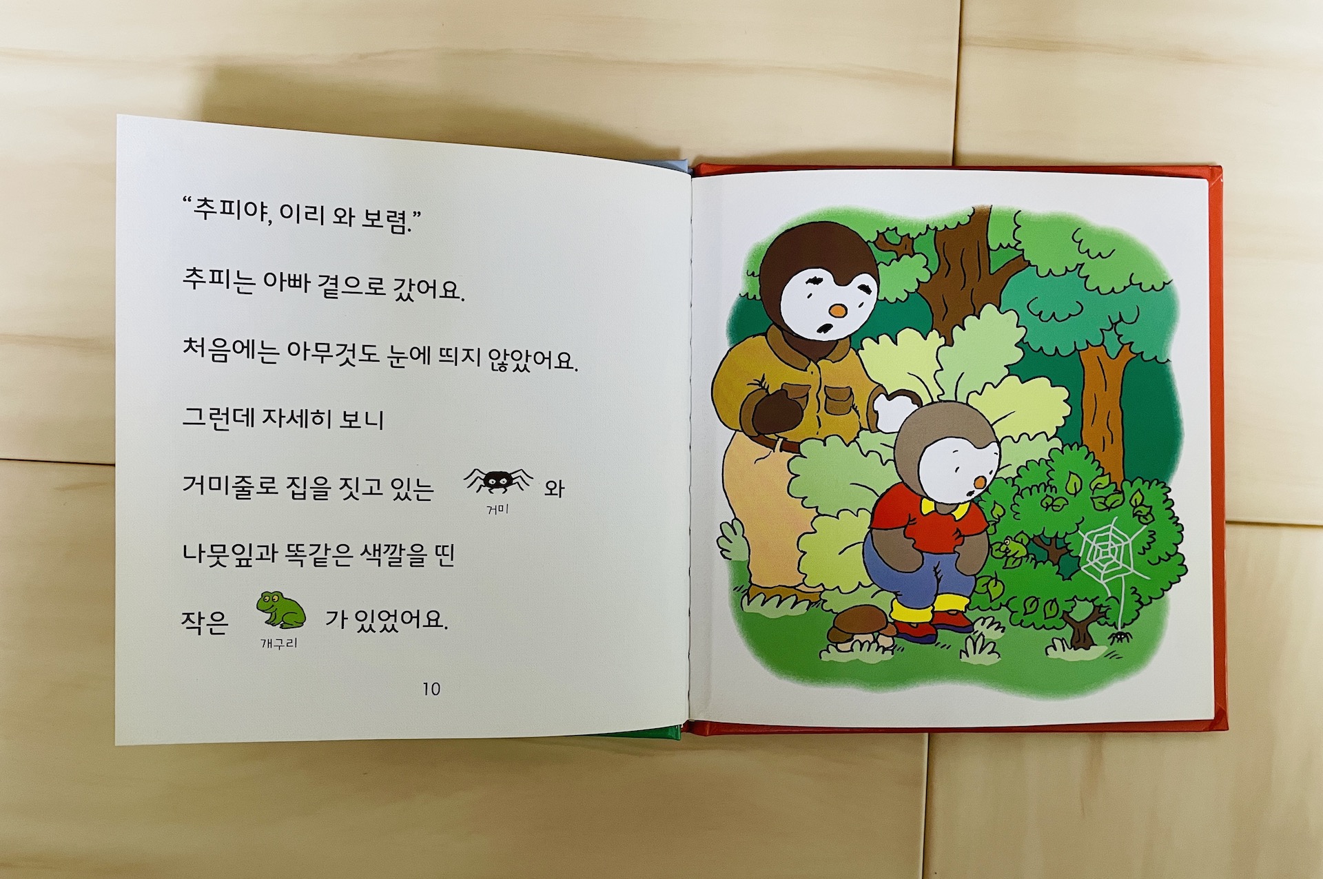 추피책은 간단하고 쉬운 내용과 적절한 이미지 배치로 어린아이들이 쉽게 집중할 수 있습니다. 책 한권 한권이 짧게 구성되어 있어 읽어주는 부모 입장에서도 부담되지 않고 싫증이 나기전에 다른 에피소드로 넘어갈 수 있기 때문에 여러권을 읽어줘도 아이들이 계속 관심을 가지고 읽을 수 있습니다. 특히나 아이를 재우기 전에 읽어주는 도서로서 굉장히 좋은데, 책이 얇고 가볍기 때문에 누워서 책을 들고 읽는데 부담이 없기 때문입니다. 또한 책이 가볍다는 것은 아이가 관심있는 책을 들고오기에도 부담이 없다는 것이기 때문에 장점이 됩니다.