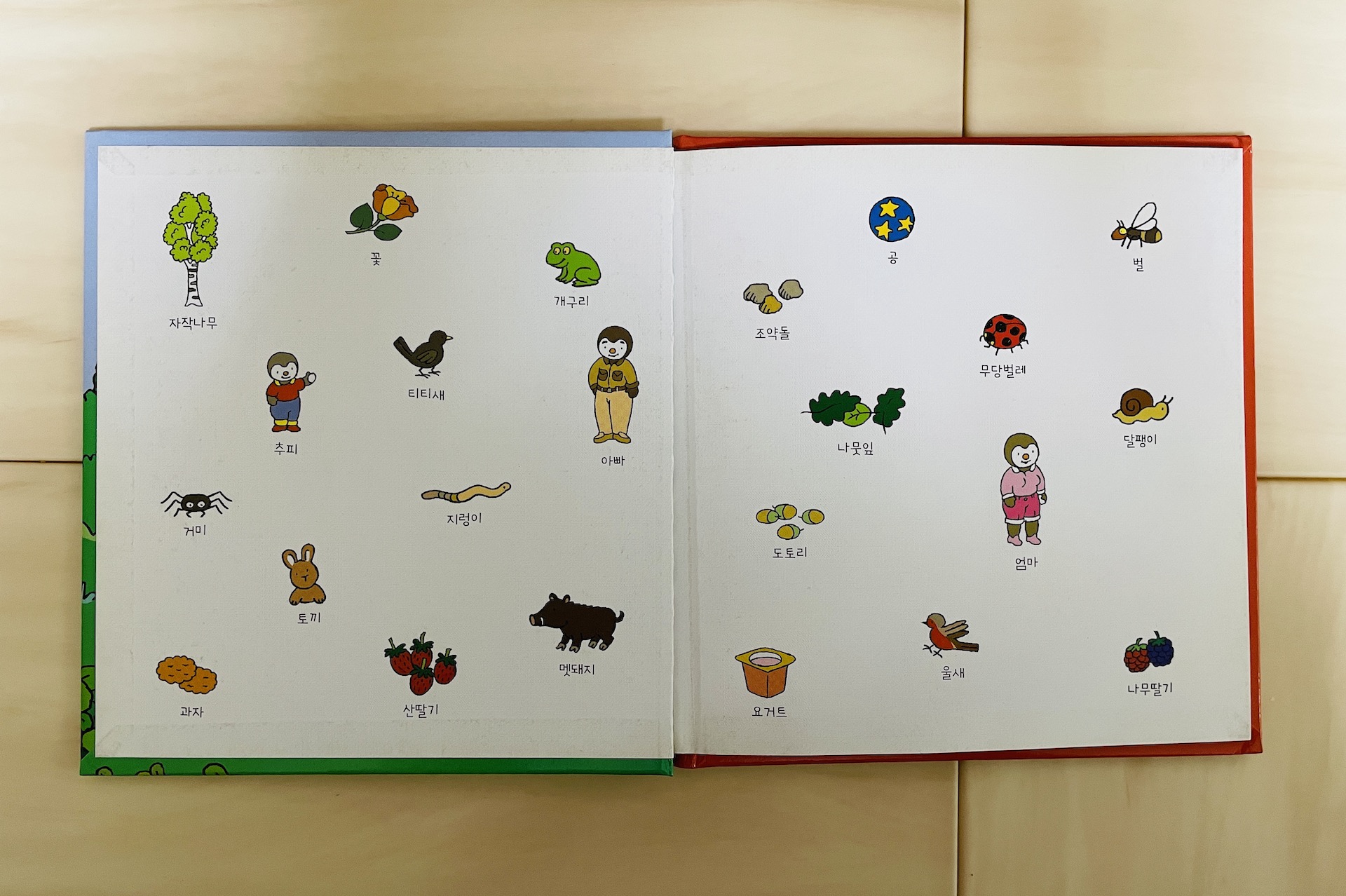 첫 페이지에는 책에서 등장하는 낱말과 이미지를 배치하고 있습니다.